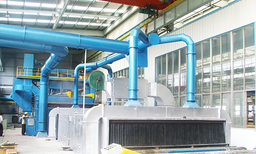 拋丸清理機工作時產(chǎn)生的含塵氣流經(jīng)過管道進入袋式除塵器。含塵氣流在除塵器的作用下形成旋風,大顆粒灰塵降在灰斗內(nèi),帶有小顆粒的灰塵氣流經(jīng)布袋過濾后,通過高壓離心式通風機進入煙筒,排放的粉塵濃度不高于120mm/m3。
